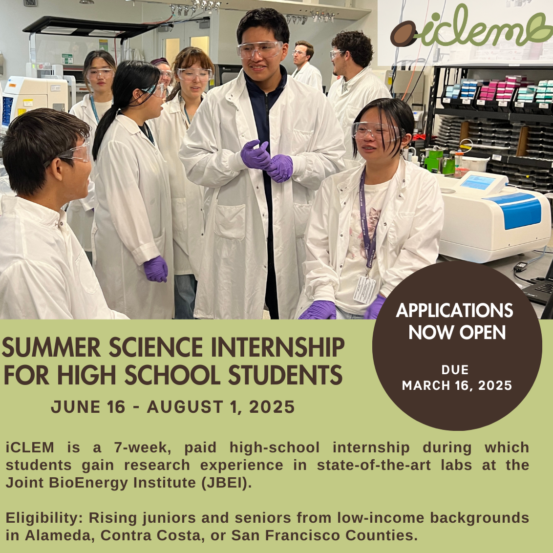 The Introductory College Level Experience in Microbiology (iCLEM) is a paid summer science intensive for economically disadvantaged high school sophomores and juniors. The program seeks to broaden students’ understanding of biotechnology, microbiology, and biofuels. In addition to completing a research project, the program also exposes students to career exploration and preparation for the college application process.
